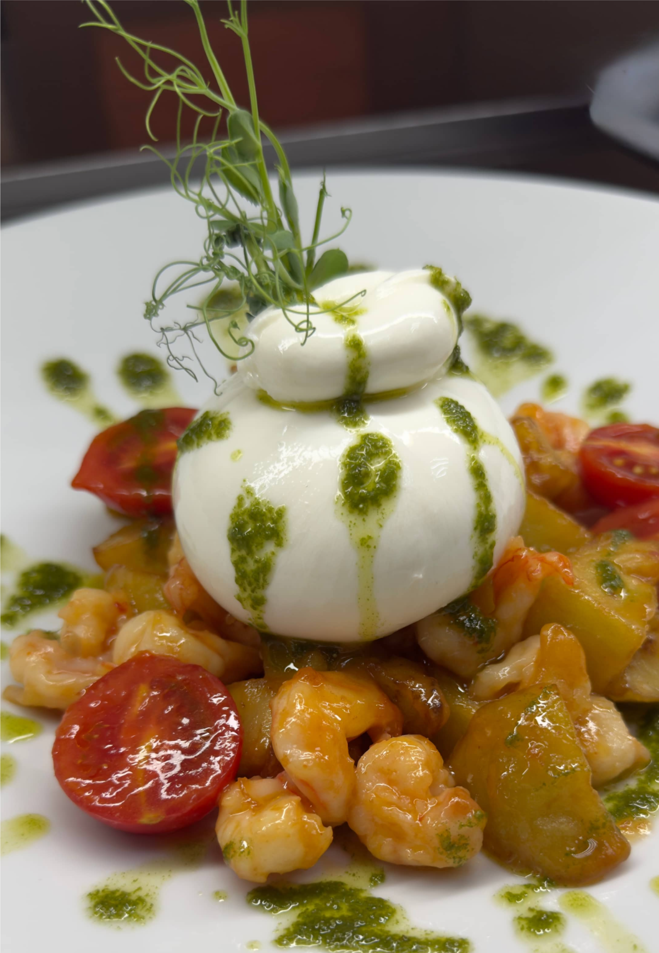 Тартар із жовтоперого тунця на слайсах томатів та гуакомоле із авокадо хаас, подається з ікрою тобіко.